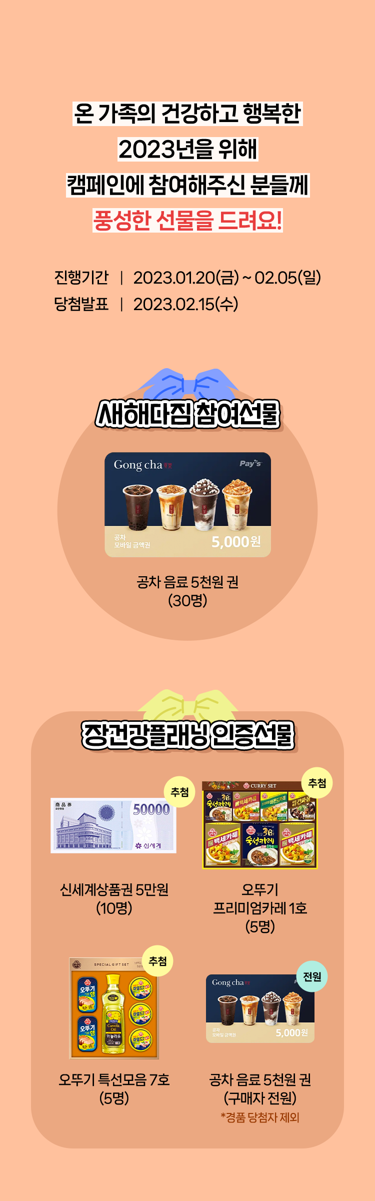 - 구매인증자 전원 제공되는 공차 음료 5천원권의 경우 추첨 선물 3가지 당첨자는 제외됩니다.